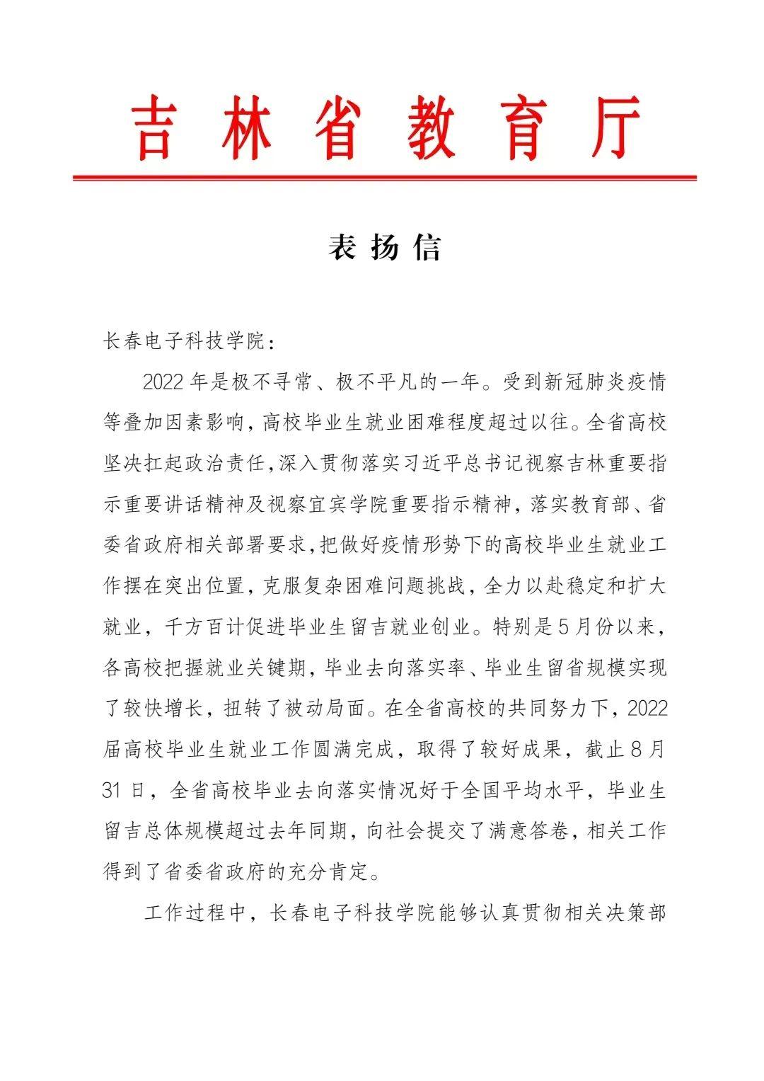 近日,吉林省教育廳向我校發(fā)來一封表揚信,表揚我校在 2022 年畢業(yè)生就業(yè)工作中為穩(wěn)定全省高校畢業(yè)生就業(yè)大局做出了重要貢獻。信中指出,我校能夠認真貫徹相關決策部署,落實“一把手”工程,堅持就業(yè)優(yōu)先,堅持防疫、就業(yè)“兩手抓”,深入開展“百日沖刺”系列活動,持續(xù)落實“創(chuàng)業(yè)有你就在吉林”“奮斗有我就在吉林”主題活動。學校謀劃實施就業(yè)質量提升工程,打造“彩虹橋”特色項目,不斷豐富就業(yè)工作方式方法,積極拓展市場化崗位資源。學校就業(yè)部門工作人員、院系負責同志、畢業(yè)生輔導員等,在畢業(yè)生就業(yè)指導和服務中付出了很多辛苦努力。