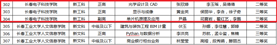 我校教務(wù)處和教師發(fā)展中心高度重視此次大賽,積極響應(yīng),做好大賽宣傳組織動(dòng)員工作。教務(wù)處參照《第三屆全國(guó)高校教師教學(xué)創(chuàng)新大賽評(píng)價(jià)標(biāo)準(zhǔn)》組織全校老師開(kāi)展初賽評(píng)選,通過(guò)老師報(bào)名、參賽,評(píng)選出校級(jí)優(yōu)秀獎(jiǎng),并推薦其中 6 名教師參加省級(jí)復(fù)賽及決賽。教務(wù)處組織專(zhuān)家為 6 名參加省賽的老師們逐一輔導(dǎo)、點(diǎn)評(píng),并組織錄課。最終張欣婷老師的《光學(xué)設(shè)計(jì)及CAD》課堂、黃金英老師的《顯示與成像》課堂、尹晶老師的《單片機(jī)原理及應(yīng)用》課堂通過(guò)初賽、復(fù)賽、決賽,層層選拔,脫穎而出,并分別獲得此次大賽新工科組的二等獎(jiǎng)、三等獎(jiǎng)。