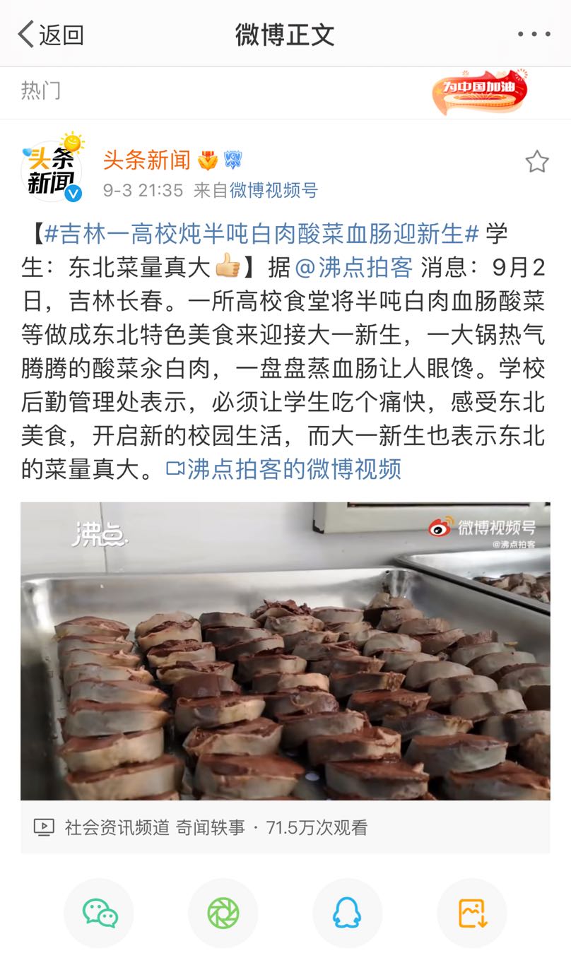 【頭條新聞】#吉林一高校燉半噸白肉酸菜血腸迎新生# 學(xué)生:東北菜量真大